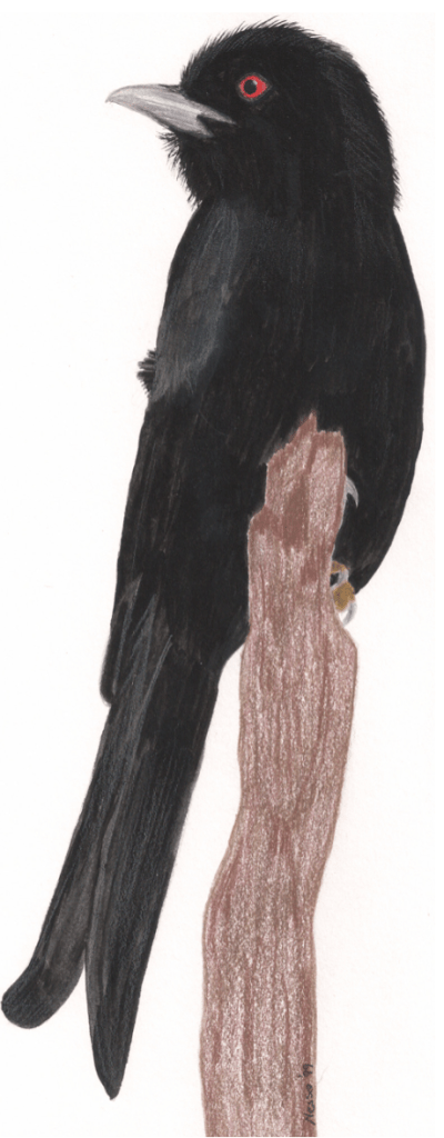 The Pin-tailed Whydah (Vidua macroura) is common in open habitats, including agricultural fields. During breeding, the adult male sports a long black tail, white underparts and bright reddish bill, while in non-breeding plumage, both male and female are substantially duller in appearance. The female remains relatively drab in all seasons, only changing bill colour during breeding. During the breeding season, males are particularly active and appear somewhat disruptive whilst in display to numerous females. A belief of some Shona is that the male is particularly vain and always attracts at least six females into his ‘harem’. The male thus is referred to as ‘the King of six’. In addition, the male is said to be ‘de-plumed’ by birds of prey following every breeding season to humble him. I was unable to adequately corroborate this, and it is also possible that this is derived from a similar tale historically told by people of Afrikaans origin, who name this bird ‘Koningrooibekkie’ or ‘King red-beak’.